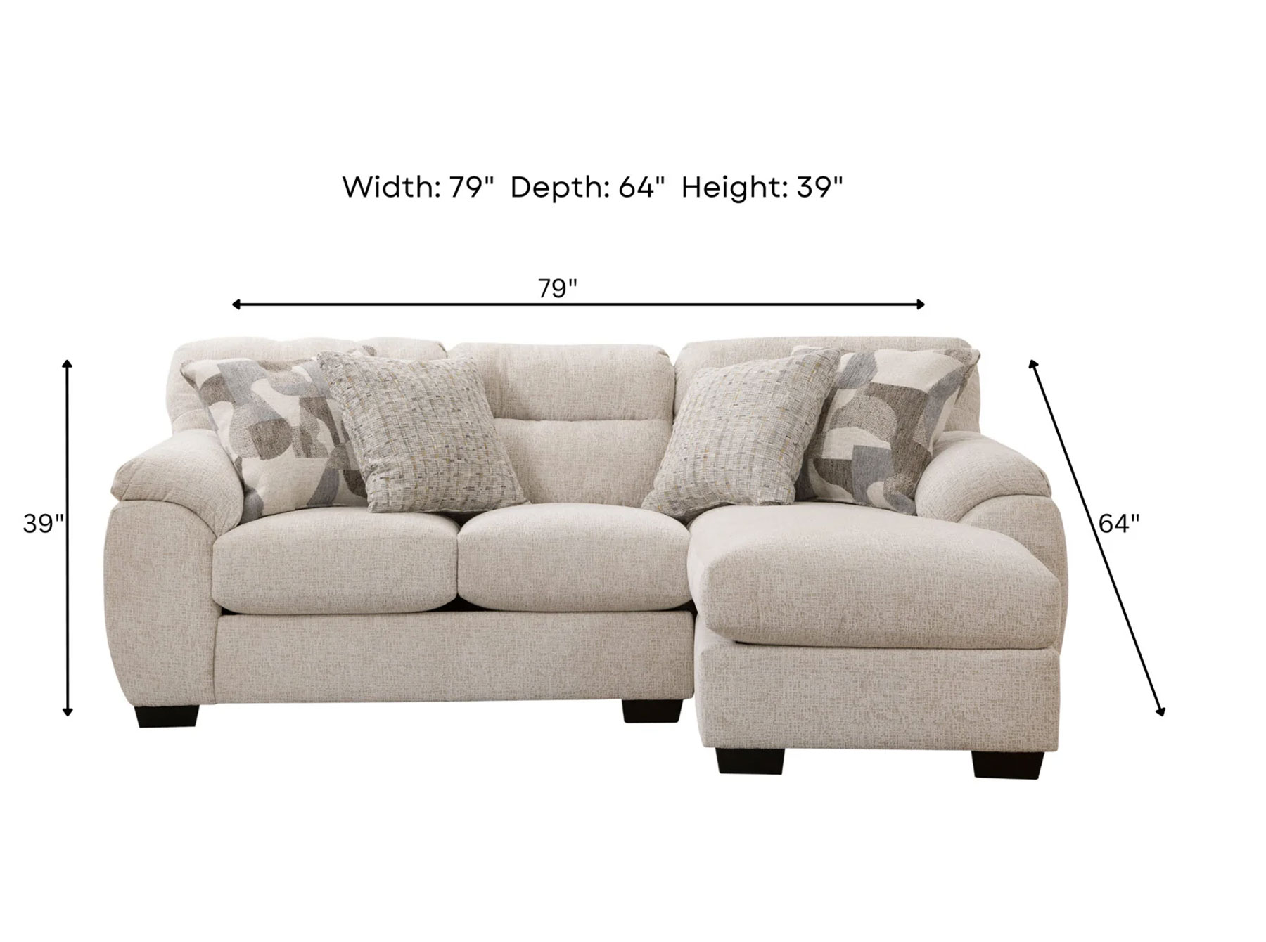 Experience ultimate comfort with our casual two-piece sectional, complete with a chaise lounge. Designed with soft pillow arms and attached back cushions for plush seating, the reversible seat cushions add to its durability and appeal. Upholstered in a beautiful tone-on-tone textured chenille in a sophisticated black color, this sectional is complemented by accent pillows featuring a modern abstract pattern in shades of grey and blue on an ivory background. Perfect for accommodating up to four people comfortably, this sectional is an ideal addition to any living space.