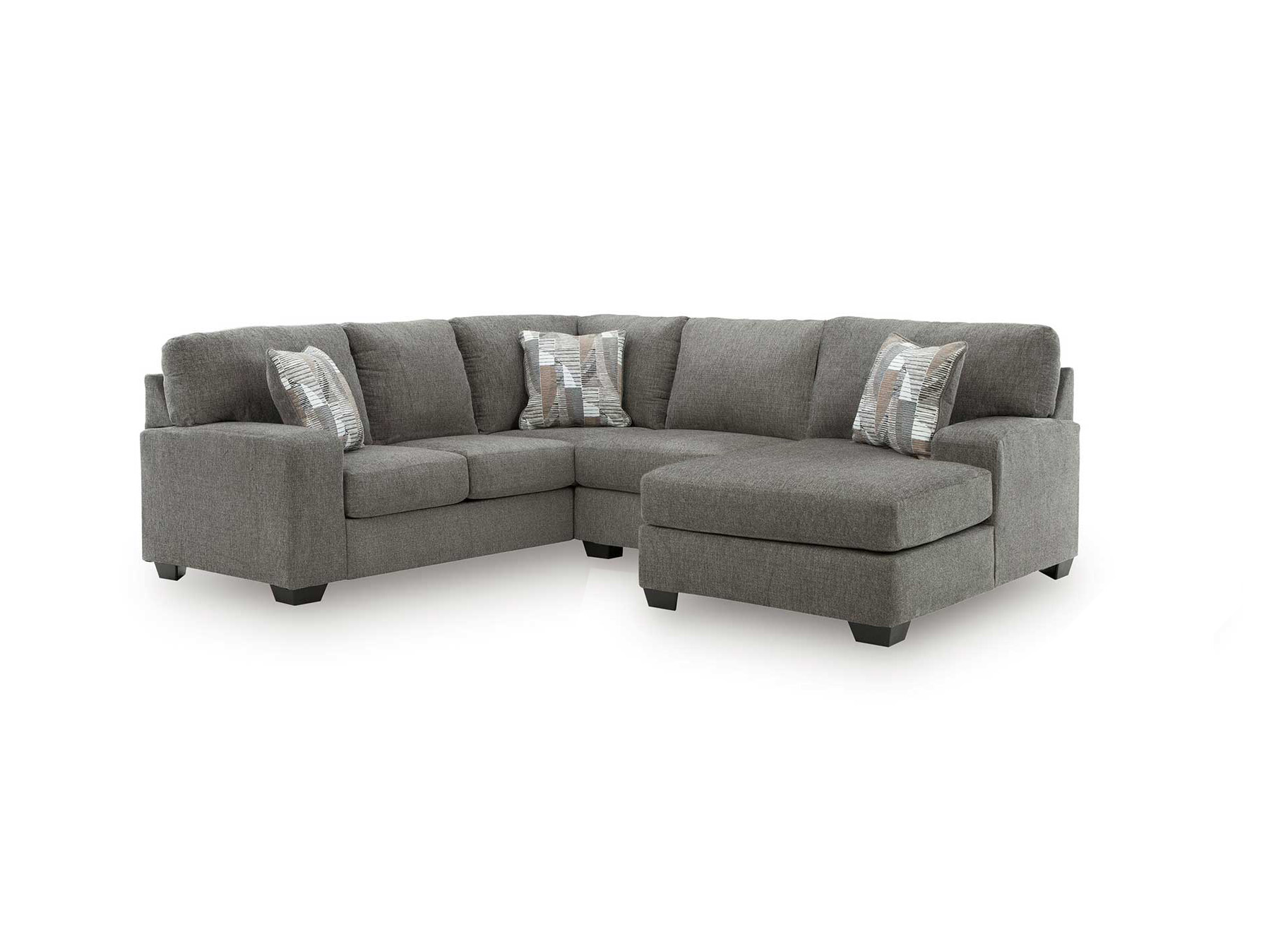 Why choose between classic comfort and modern design" This sectional with chaise welcomes day-to-day relaxation in style. Its dimensional, menswear-inspired upholstery brings a designer touch to the easygoing silhouette. Gear up for game night or settle in to stream your favorite show-this sectional is an ideal supporting character for your living room hangs.FeaturesIncludes 3 pieces: left-arm facing sofa with corner wedge, armless chair and right-arm facing corner chaise"Left-arm" and "right-arm" describe the position of the arm when you face the pieceCorner-blocked frameAttached back and loose seat cushionsHigh-quality foam cushions wrapped in poly fiberAccent pillows includedPillows with soft polyfillPolyester upholsteryExposed feet with faux wood finishPlatform foundation system resists sagging 3x better than spring system after 20,000 testing cycles by providing more even supportSmooth platform foundation maintains tight, wrinkle-free look without dips or sags that can occur over time with sinuous spring foundations
