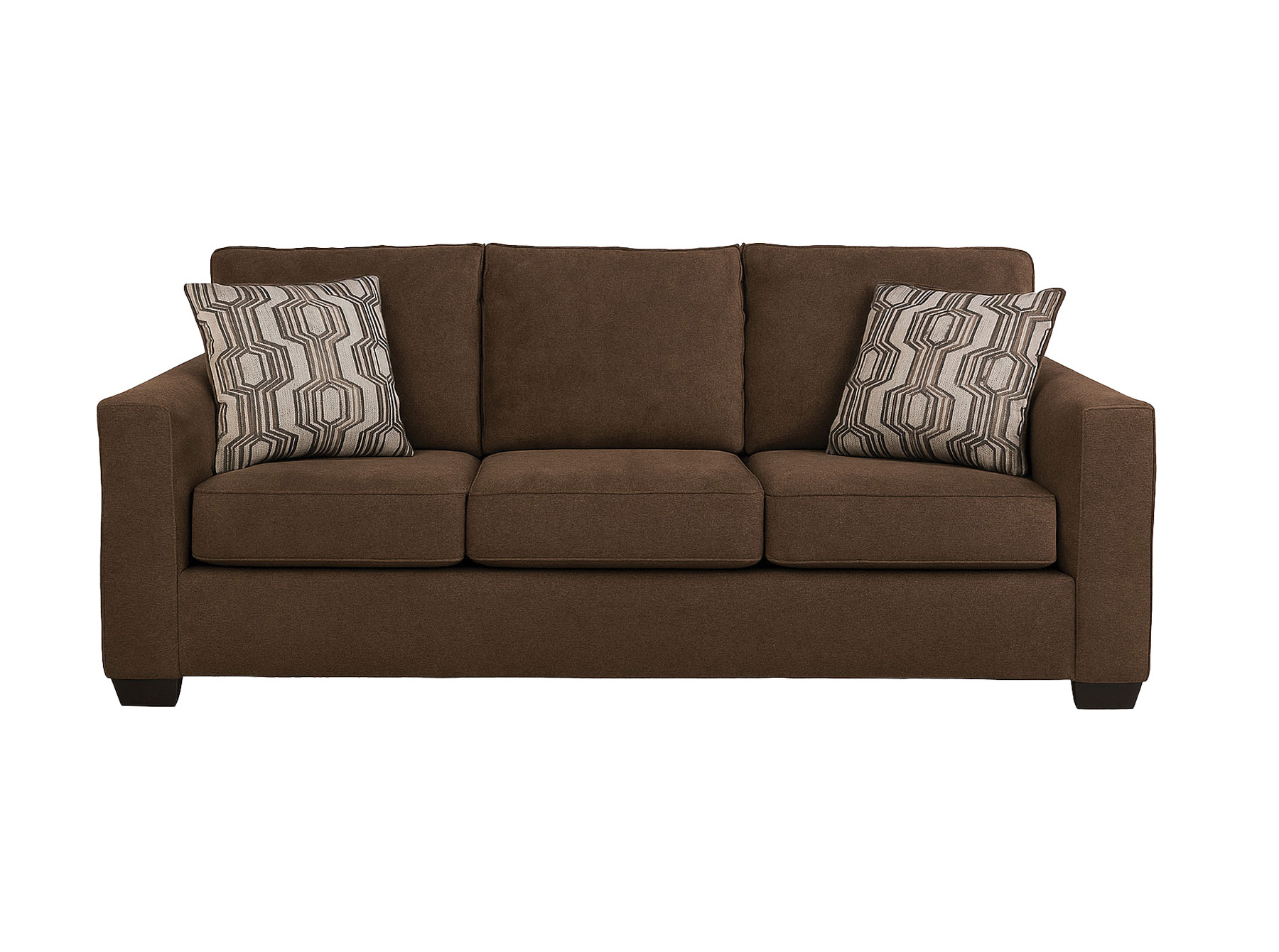 The Natalie Umber Sofa offers the perfect combination of contemporary style and everyday comfort. Upholstered in a rich umber brown fabric, it features clean lines, wide track arms, and generously padded cushions that create an inviting and modern look. The plush seating and supportive back cushions provide comfort for relaxing or entertaining. Coordinating geometric accent pillows complete the design with a stylish touch.