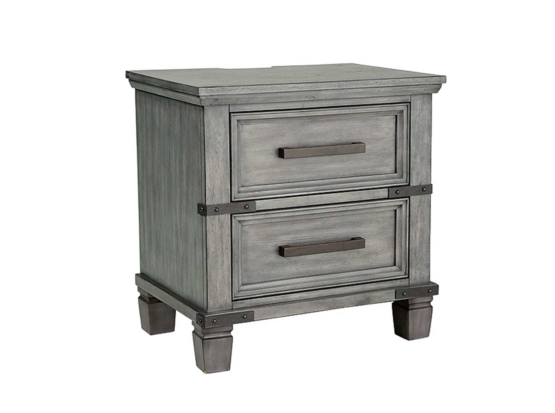 What's old is what's new with this nightstand. Serving up a fresh look in urban farmhouse style, this eclectic piece features a light weathered gray finish with dark aged bronze-tone bar pulls and metal straps for a casually cool sensibility. Profiled drawer frames, thick-profiled top moulding and tapered legs are the earmarks of timeless design.FeaturesMade with acacia wood, acacia veneer and engineered woodLight weathered gray finishMetal accents and straps with aged bronze-tone finish2 smooth-gliding drawers with dovetail construction1 electrical outlet; 2 USB charging portsPower cord included; UL Listed