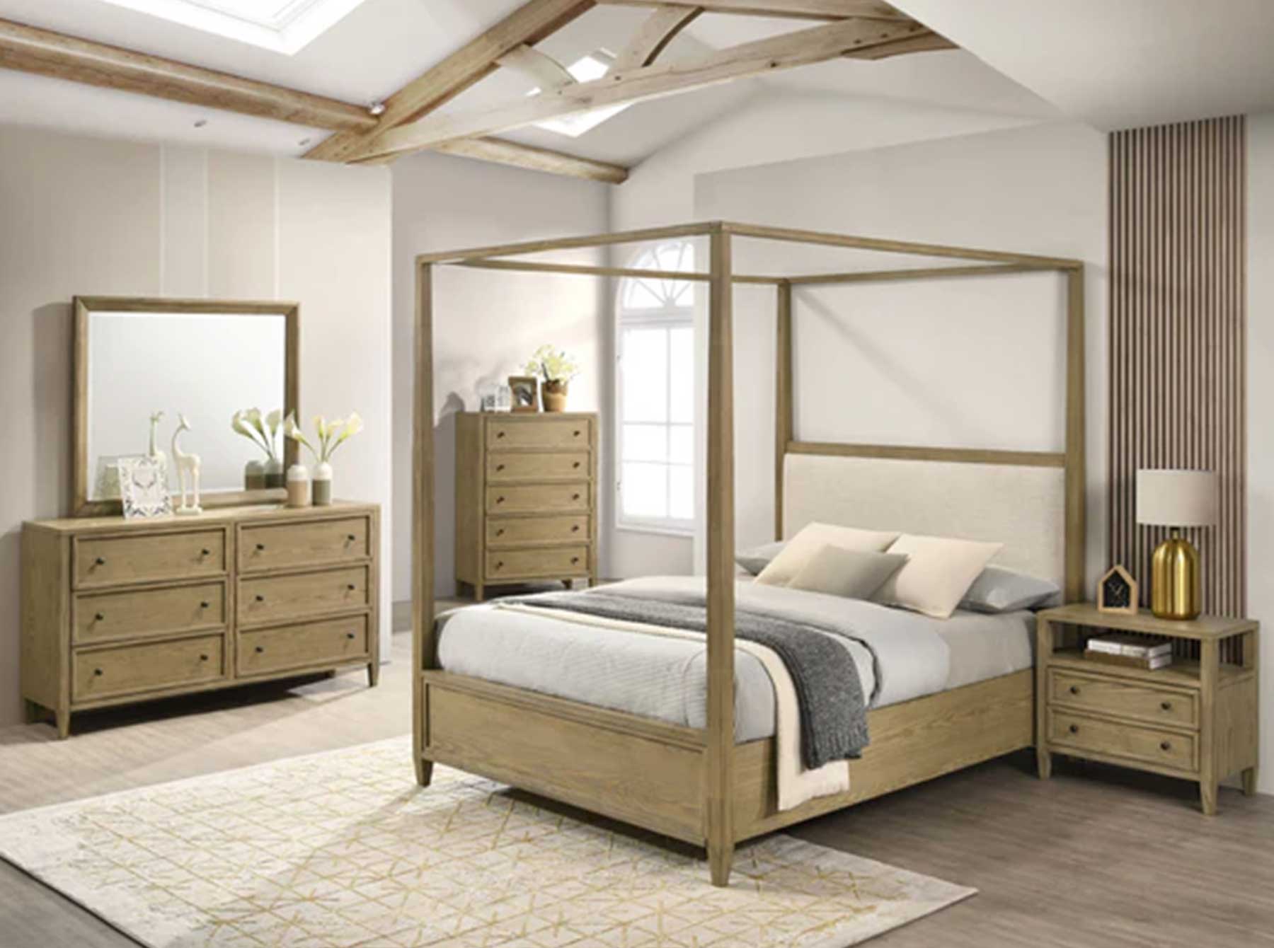 This bedroom set is a harmonious blend of rustic charm and modern simplicity, ideal for creating an inviting and warm atmosphere. The set features a stunning canopy bed as its centerpiece, which boasts a clean-lined frame and a natural wood finish that exudes understated elegance. The bed's headboard, with a gentle fabric inset, offers a soft contrast to the wood, providing a cozy backdrop for restful nights. Complementing the bed are a spacious dresser with a matching mirror and a convenient nightstand, each piece echoing the bed’s minimalist design and warm wood tones.