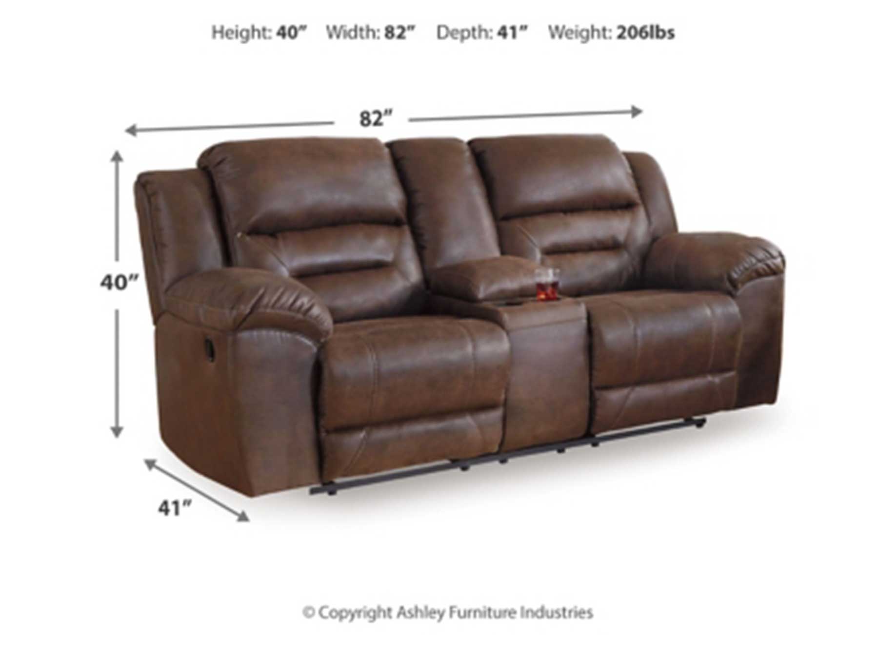 For those who love the cool look of leather but long for the warm feel of fabric, the Stoneland reclining loveseat with console delivers both with ease. Its high-performance padded faux leather is remarkably durable and easy to clean, making it just the thing for family spaces. Channel-stitched back cushions provide indulgent lumbar support for maximum comfort—not to mention fashion-forward flair.